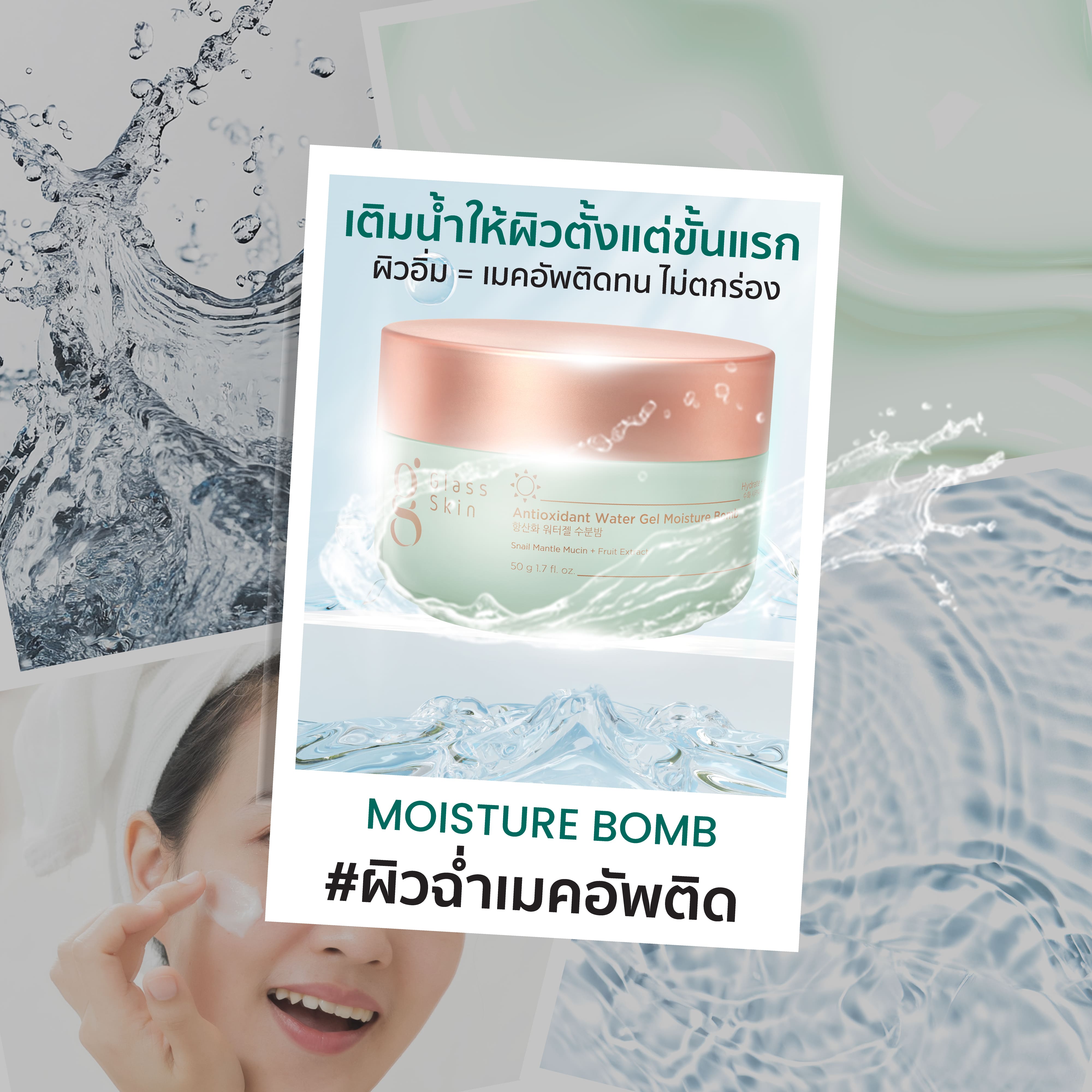 สำหรับขั้นตอนการเตรียมผิวที่สำคัญที่สุด เราขอแนะนำไอเทมเด็ดที่จะมาเป็นฮีโร่จบปัญหาผิวขาดน้ำ นั่นคือ Glass Skin Antioxidant Water Gel Moisture Bomb มอยซ์เจอร์ไรเซอร์เนื้อเจลบางเบาตัวนี้ ถูกคิดค้นมาเพื่อ "เติมน้ำให้ผิวตั้งแต่ขั้นแรก" โดยเฉพาะ เมื่อผิวได้รับความชุ่มชื้นจนอิ่มฟู ก็จะกลายเป็นผิวที่สมบูรณ์แบบสำหรับเมคอัพ ทำให้ เมคอัพติดทน ไม่ตกร่อง พร้อมเปลี่ยนผิวพังให้เป็นผิวสวยฉ่ำโกลว์ได้ในทันที