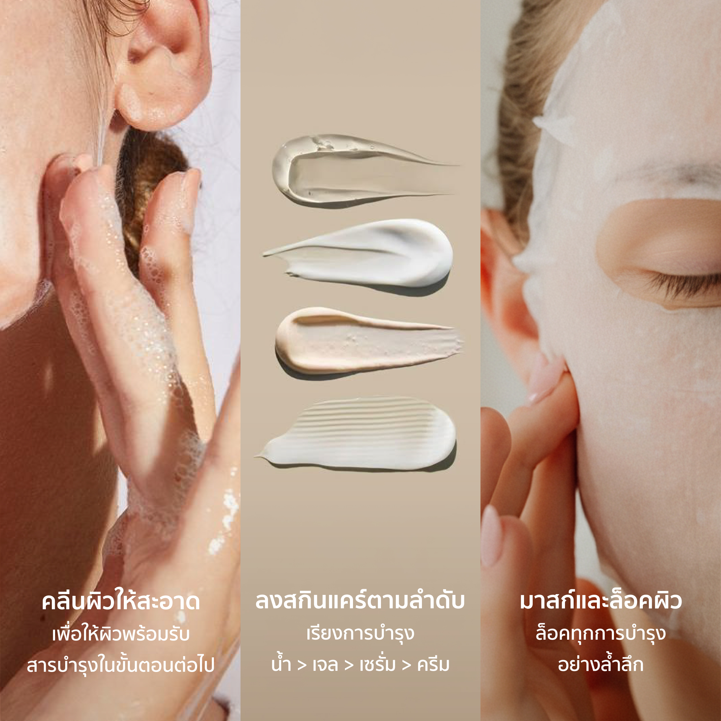 2.ลงสกินแคร์ตามลำดับ: เพื่อให้สกินแคร์ซึมซาบได้ดีที่สุด ควรเรียงลำดับการลงดังนี้ เนื้อบางเบา > เนื้อเข้มข้น หรือตามลำดับง่ายๆ คือ น้ำ > เจล > เซรั่ม > ครีม