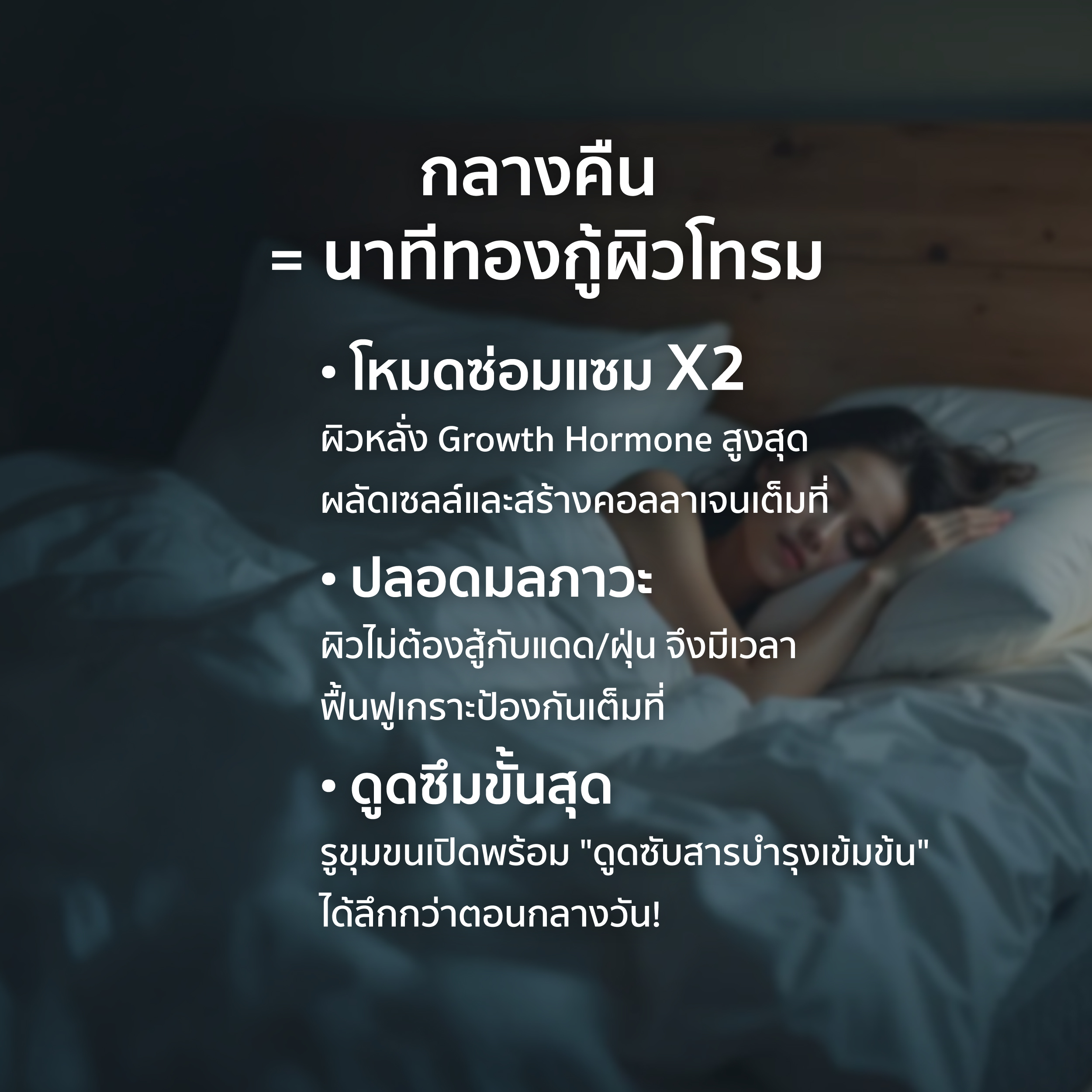 ในขณะที่เราหลับ ร่างกายและผิวพรรณจะเข้าสู่กระบวนการซ่อมแซมตัวเองอย่างเต็มที่ ซึ่งเป็นช่วงเวลาที่สกินแคร์จะทำงานได้อย่างมีประสิทธิภาพสูงสุด