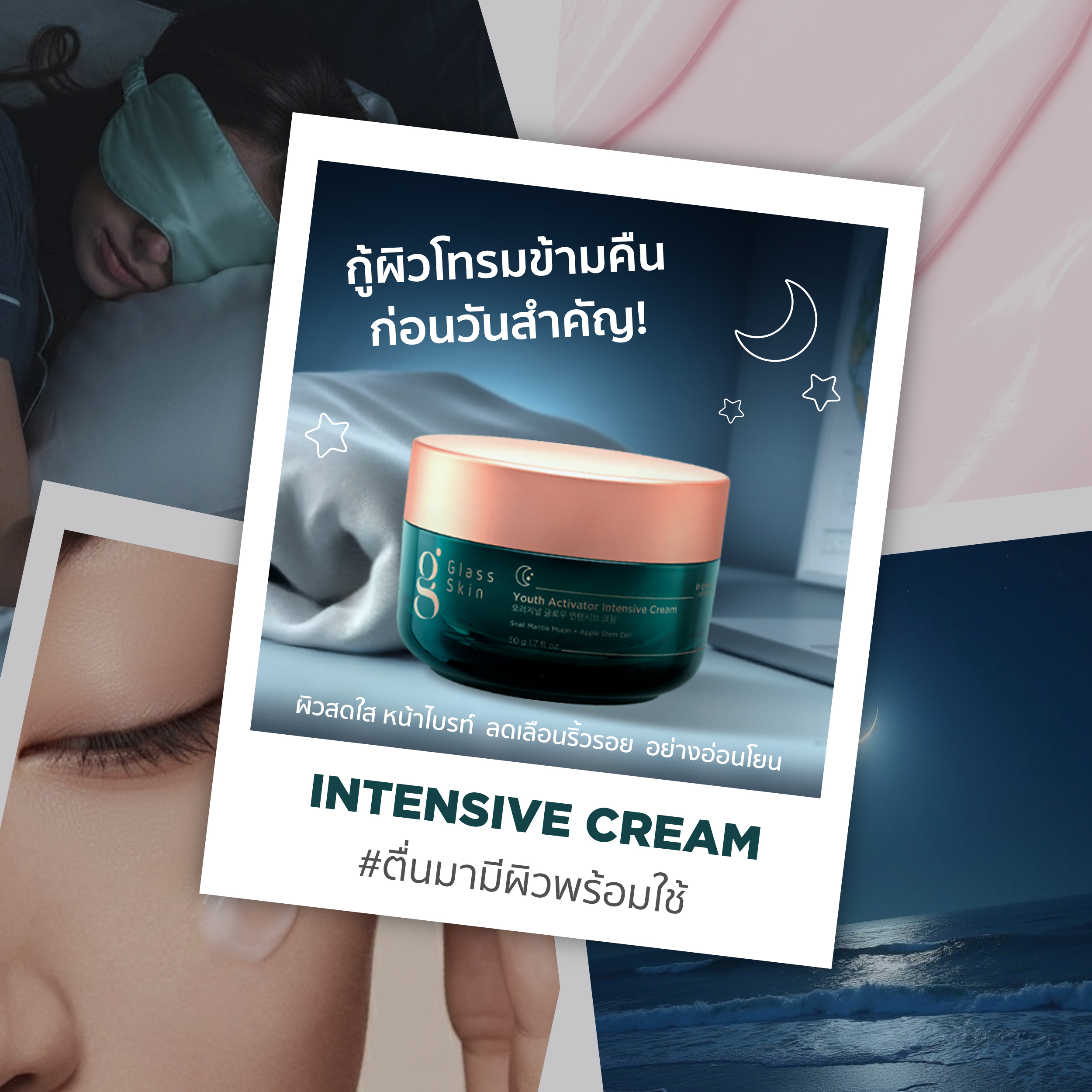 เพื่อผลลัพธ์ผิวสวยข้ามคืนที่สมบูรณ์แบบ เราขอแนะนำ Glass Skin Youth Activator Intensive Cream ไนท์ครีมสูตรเข้มข้นที่ถูกพัฒนามาเพื่อการฟื้นฟูผิวในยามค่ำคืนโดยเฉพาะ ฟื้นฟูผิวที่อ่อนล้าให้กลับมาสดใส หน้าไบรท์