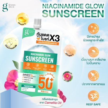 Niacinamide Glow Sunscreen ผิวไบรท์ x3 ✨ บำรุงให้ผิวแลดูกระจ่างใส เนื้อบางเบา ไม่เหนียวเนอะหนะ SPF50+ PA++++ (1 กล่อง 6 ซอง) ( 7ml. / 1 ซอง )
